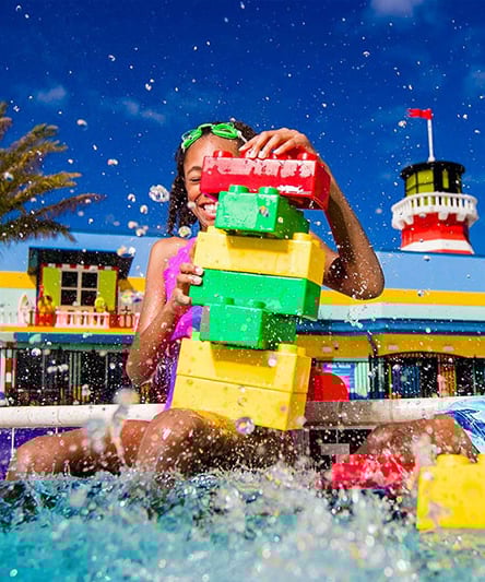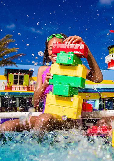 Um pequeno complexo de piscinas com atrações, no fundo do parque LEGOLAND